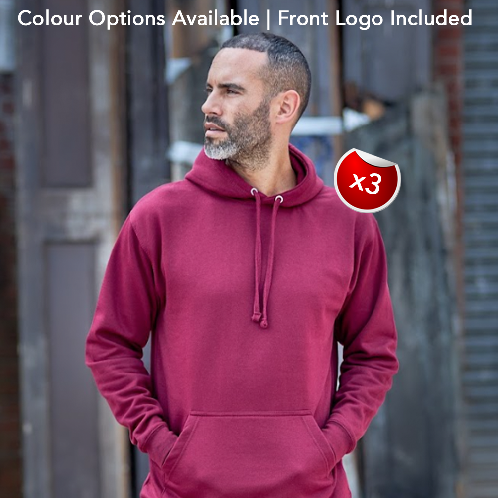 Get 3 x Hoodies in the colour of your choice with left chest logo embroidery - you can add other embroidery areas at an additional cost.